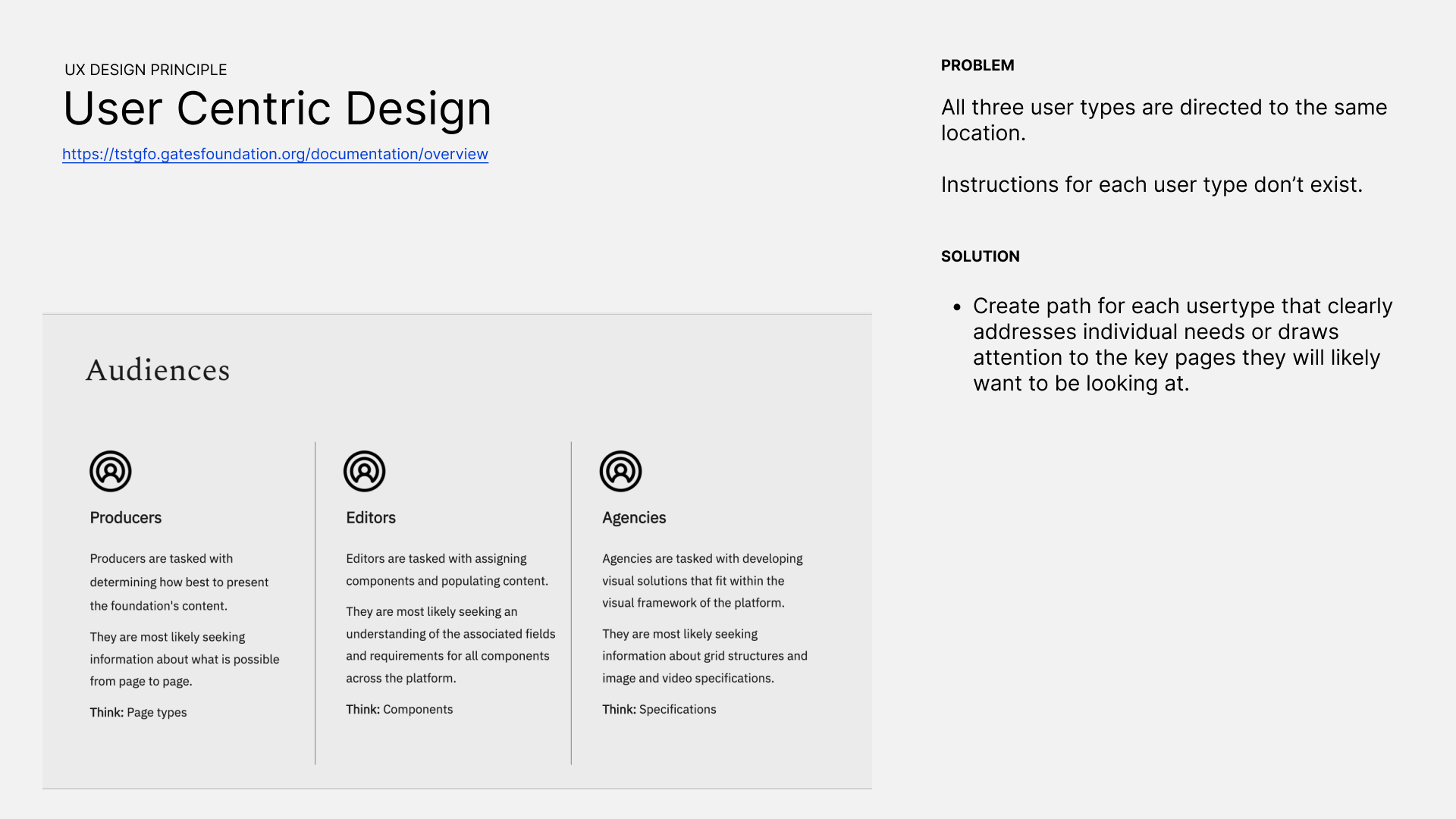 - Nesting "design principles" under "overview" was misleading. We added a parent section and ditched the internal jargon, and recommended a clear label such as "design guidance", or "brand guidelines" instead of "getting started" because who knows what that could mean.